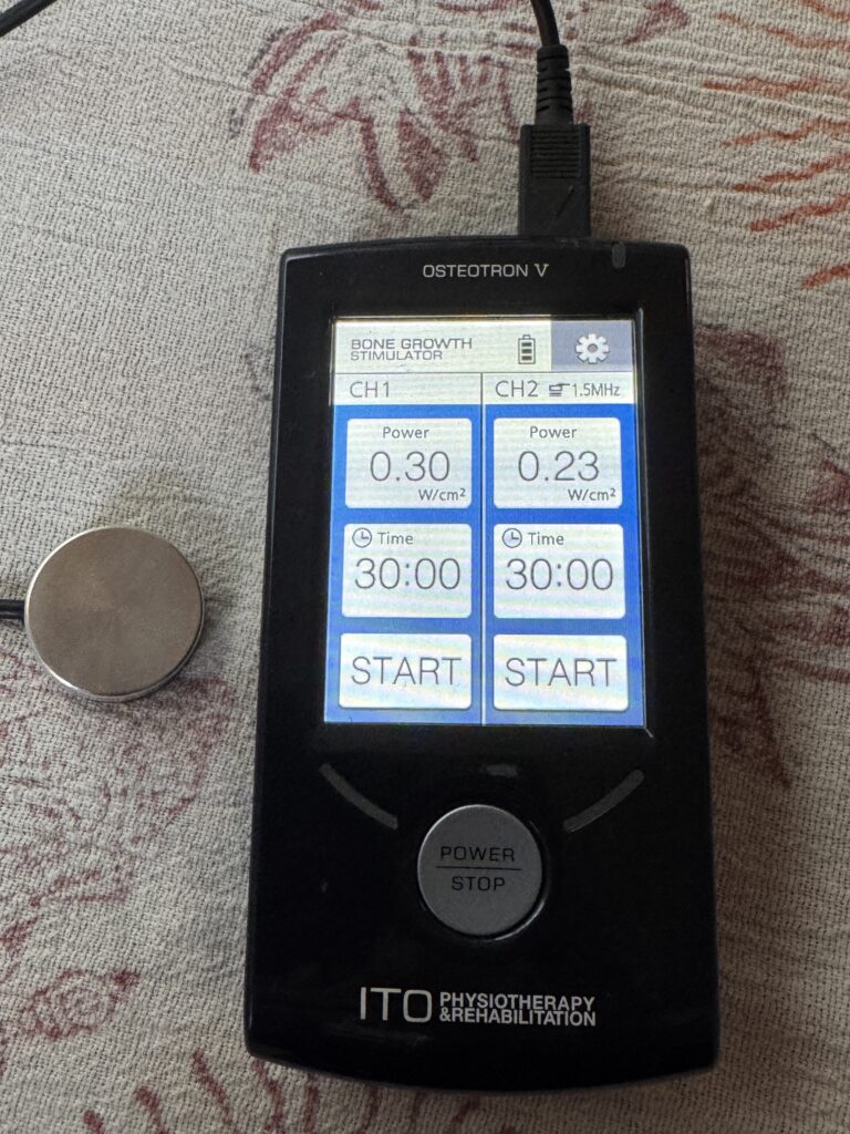 「骨折に対する超音波は、毎日同じ条件で刺激を入れることで、骨がくっつく流れを後押しする考え方です。